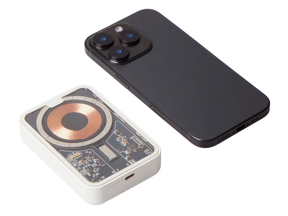 Беспроводной магнитный внешний аккумулятор MagnifIQ — технологичный и стильный power bank с эффектной прозрачной передней панелью, сквозь которую видны мощные магниты, индукционная катушка и электронная начинка. Ёмкость 10 000 мА·ч обеспечивает до 2–3 полных зарядов смартфона, а поддержка быстрой беспроводной зарядки до 15 Вт (с совместимостью QC/PD) делает процесс зарядки максимально быстрым и удобным. Двунаправленный USB-C порт позволяет как заряжать другие устройства, так и сам аккумулятор. Обе стороны корпуса подходят для нанесения логотипа: лицевая — через прозрачную панель, задняя — на приятное на ощупь soft-touch покрытие. Компактный, надёжный и сильный — идеальный технологичный продукт для продвижения и ежедневного использования. Поставляется в качественной упаковке с шубером, Двунаправленный кабель USB-C и кабель USB-A – USB-C в комплекте. • Прозрачная передняя панель — демонстрирует внутреннюю начинку и подчеркивает технологичность бренда. • Магнитная беспроводная зарядка 15 Вт • Ёмкость 10 000 мА·ч — хватает на несколько полных зарядов смартфона. • Двунаправленный USB-C — универсальность для зарядки и подзарядки. • Две зоны нанесения логотипа: на прозрачную панель спереди и на soft-touch покрытие сзади. • Сильные магниты обеспечивают надёжную фиксацию на совместимых устройствах.