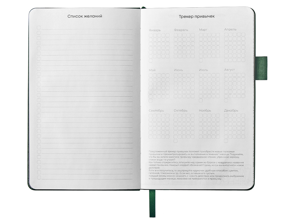 Стильный блокнот в твердой обложке из текстурной искусственной кожи, приятной на ощупь. 96 очень приятных на ощупь листов повышенной гладкости с FSC-сертификатом обеспечивают комфортное письмо и аккуратный вид записей. Необычный для блокнота вводный блок включает трекер привычек, списки книг и фильмов, а также 4 страницы для раскрашивания с картинками и мандалами. Продуманные детали — резинка для закрытия, петля для ручки и ляссе — делают использование максимально удобным. Благодаря конверту для мелочей вам всегда будет куда положить визитки, записки и другие мелочи. Идеальный вариант для выстраивания баланса между работой и отдыхом.