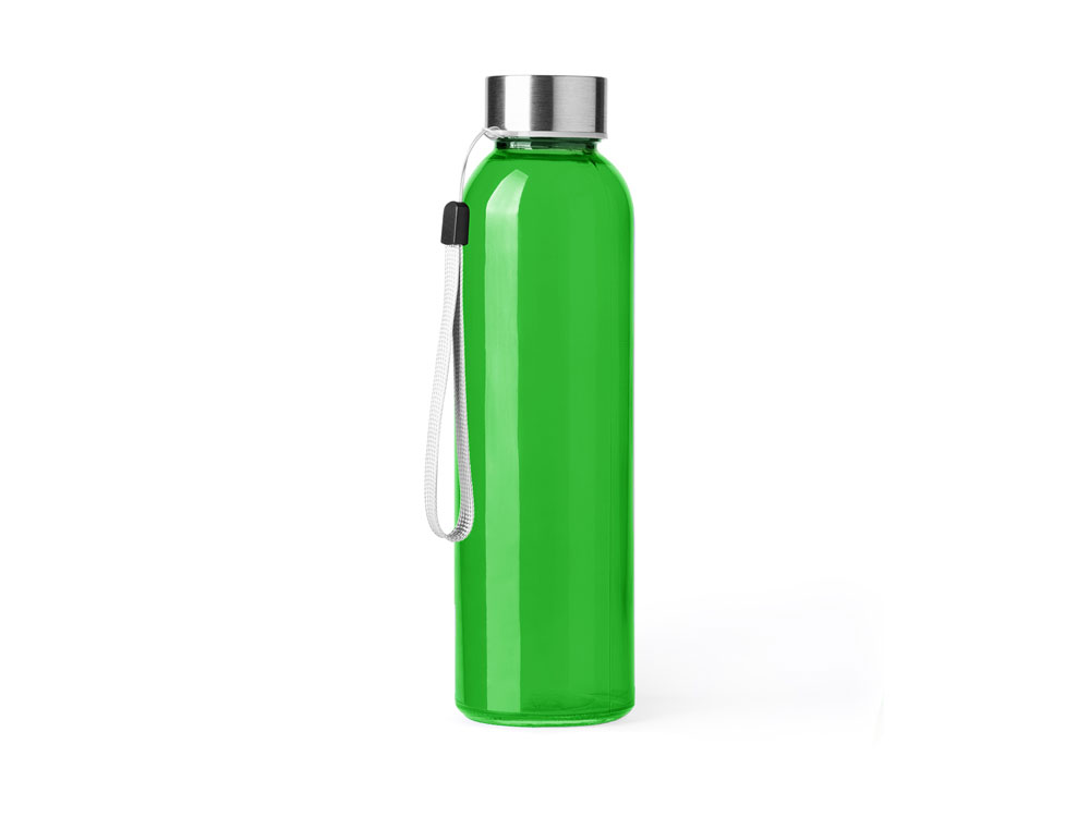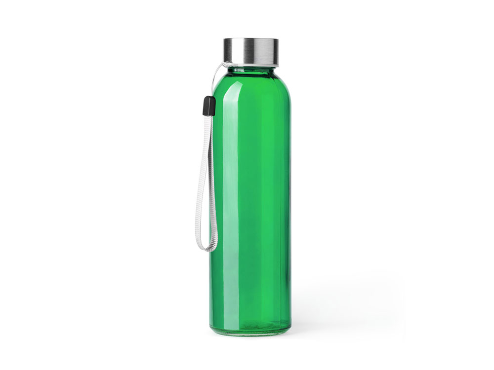 Стеклянная бутылка емкостью 500 мл. Большое разнообразие цветов, с завинчивающейся крышкой из нержавеющей стали и удобной для транспортировки благодаря ремешку серого цвета.