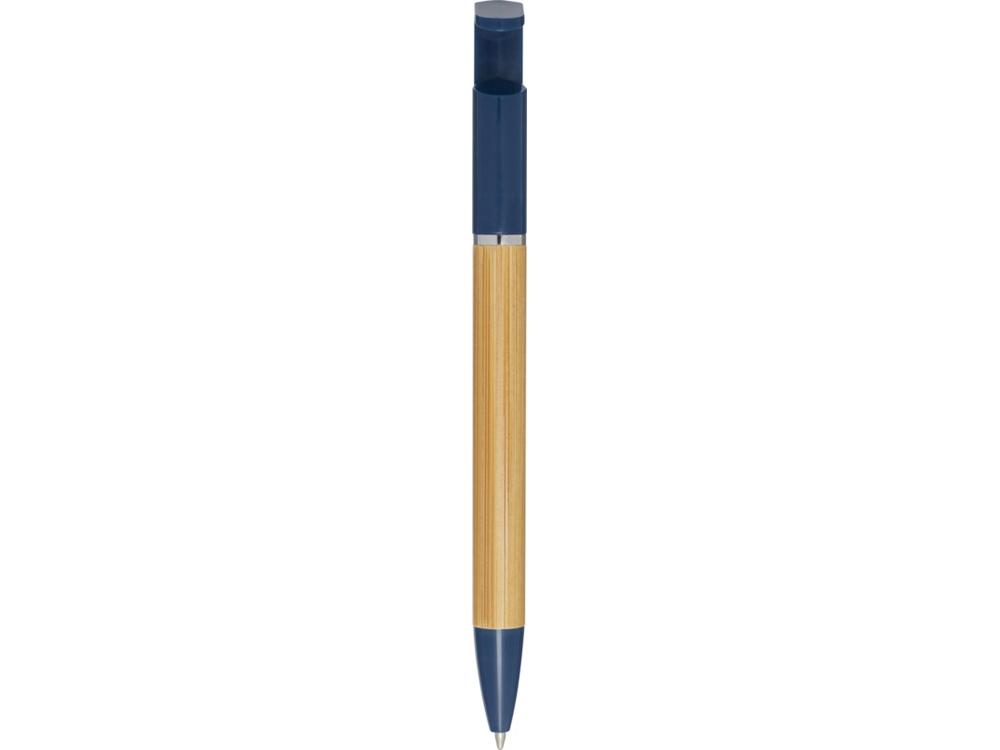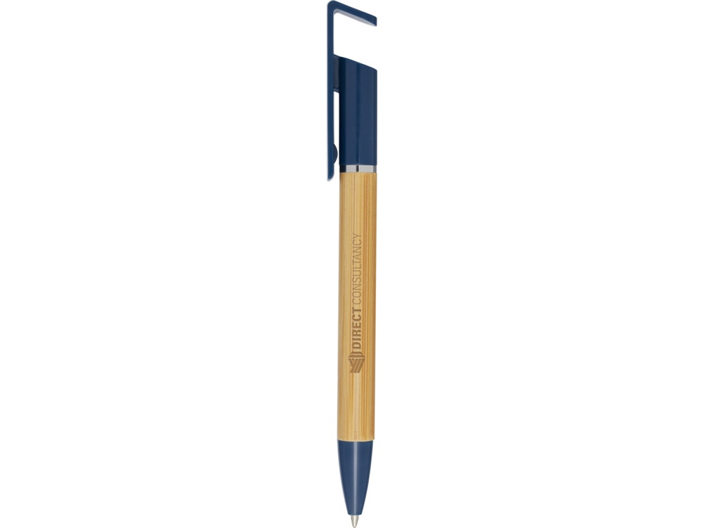 Бамбуковая шариковая ручка, которая также может служить подставкой для телефона. Кнопка и среднее кольцо изготовлены из переработанного пластика, наконечник — из латуни, а корпус — из бамбука, полученного из ответственных источников. Цвет чернил: синий. Длина непрерывной линии: 1000 метров. Размер пера: 1,0 мм. FSC certified bamboo. FSC Mix Credit N5 CU-COC-877277.