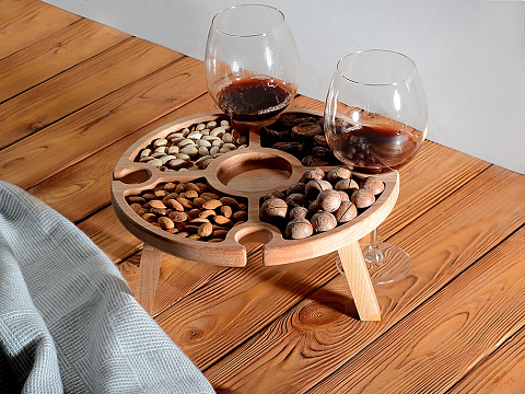 Деревянный столик на складных ножках может быть использован как во время пикников на открытом воздухе, так и дома, где его можно использовать прямо на полу. Столик позволяет подать 4 вида различных закусок, не смешивая их, благодаря четырем сепарированным секциям, в которые можно поместить ягоды, орехи и другие снеки, желательно, сухие либо подающиеся в масле (оливки, маслины). Четыре держателя для бокала особенно актуальны во время отдыха на природе, где каждый участник пикника обязательно оценит возможность зафиксировать посуду для вина. Помимо функциональности столика не можем не отметить и его эстетичность, которая позволяет изящно преподнести вино и снеки к нему. - 4 вместительных отделения для закусок - 4 держателя для бокалов - натуральный бук, обработанный минеральным пищевым маслом - удобные складные ножки - для приятных вечеров на природе и дома Натуральный бук, из которого выполнен столик, как и любое дерево, требует ухода, который существенно продлит ему жизнь и позволит радовать своего обладателя в течение многих лет. Пропитывание пищевым маслом (растительное, льняное и т.д.) раз в один-два месяца поможет сохранять свежий вид изделия. Рекомендации по использованию: - не рекомендуется использовать в посудомоечной машине, микроволновой печи, замачивать в раковине с водой - не использовать агрессивные моющие средства - использовать мягкую губку для очищения - вытирать насухо после мытья - транспортировать изделия при температурном режиме от +5°C до +20°C - хранить в помещениях с влажностью до 65-70% - не подвергать прямым солнечным лучам - не подвергать нагреву - хранить при температуре от +5°C до +20°C - не оставлять на морозе от -10°C на более чем 6 часов