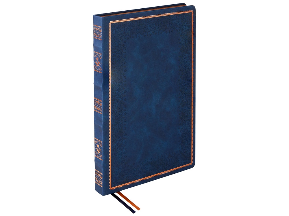 Недатированный ежедневник Royal формата А4 с твердой обложкой из искусственной кожи с имитацией нубука украшен художественным бронзовым и блинтовым тиснением. Внутри 192 страницы, выполненные из качественной бежевой бумаги в линейку плотностью 140 г/м². Два шелковых ляссе в цвет обреза блока и обложки облегчают навигацию по записям. Французский корешок дополнительно декорирован изящным бронзовым тиснением в виде виньеток. Скругленные углы обложки и блока подчеркивают стильный дизайн изделия, а блеск бронзового обреза дарит ежедневнику благородный и роскошный внешний вид.
