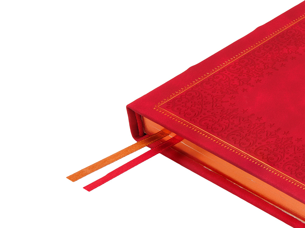 Недатированный ежедневник Royal формата А5 с твердой обложкой из искусственной кожи с имитацией нубука украшен художественным бронзовым и блинтовым тиснением. Внутри 256 страниц, выполненных из качественной бежевой бумаги в линейку плотностью 100 г/м². Два шелковых ляссе в цвет обреза блока и обложки облегчают навигацию по записям. Французский корешок дополнительно декорирован изящным бронзовым тиснением в виде виньеток. Скругленные углы обложки и блока подчеркивают стильный дизайн изделия, а блеск бронзового обреза дарит ежедневнику благородный и роскошный внешний вид.