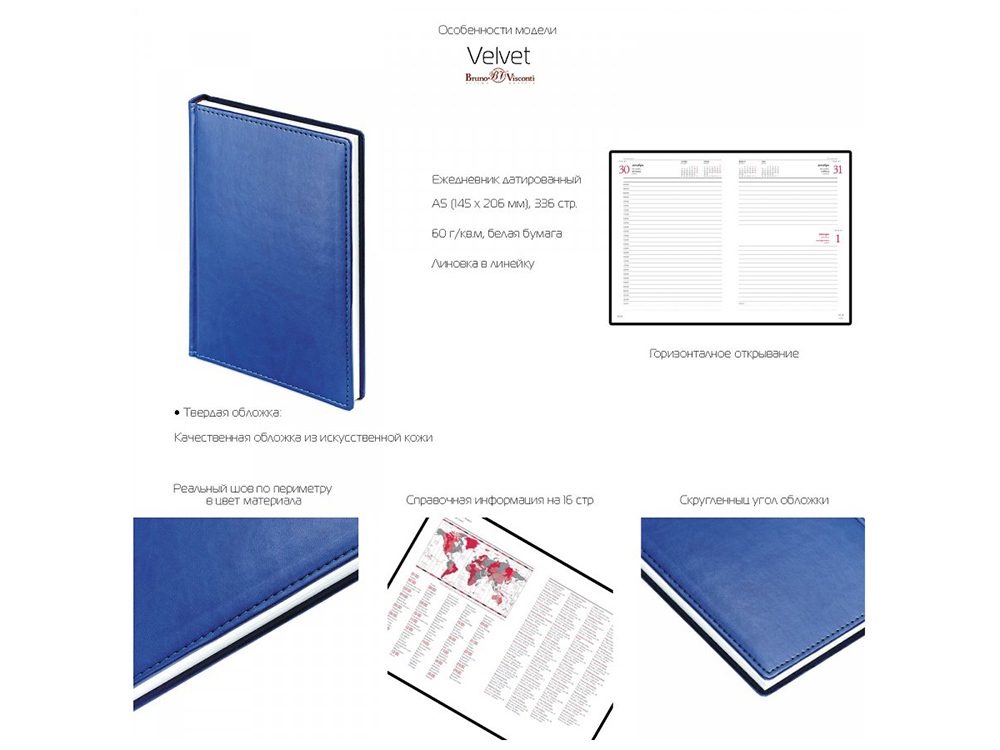 Недатированный ежедневник A5 Velvet в линейку от бренда Bruno Visconti - это качественный корпоративный подарок по выгодной цене, произведенный специально под персонализацию. Представлен в универсальном формате А5. В нем есть полезная справочная информация и телефонная книга, а также 272 страницы для записи идей, мыслей и составления рабочих планов. В серии Velvet представлены практичные и стильные модели ежедневников, в которых обложки выполнены из кожзаменителя с рельефом и прострочены по периметру декоративным швом. Закругленные уголки подчеркивают привлекательную и изящную форму ежедневника. Все ежедневники от бренда Bruno Visconti можно персонализировать с помощью тиснения обложки - золотой или серебряной фольгой. Ежедневники Velvet помогут быть успешным и эффективным в карьере и повседневной жизни!