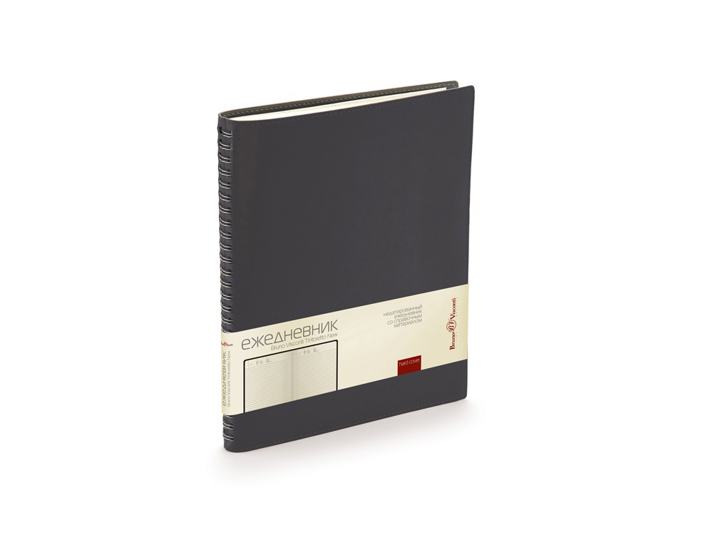 Недатированные деловой ежедневник Tintoretto. Реальный шов по периметру в цвет материала Гибкий мягкий материал обложки прекрасно подходит для нанесения тиснения. Ежедневники выпускаются в формате В5, его размеры составляют 185 х 230 мм. Блок - 136 листов соединен полускрытым металлическим гребнем. Для блока используется высококачественная бежевая бумага, обладающая плотностью 70 грамм. В начале ежедневника расположены страницы со справочным материалом.