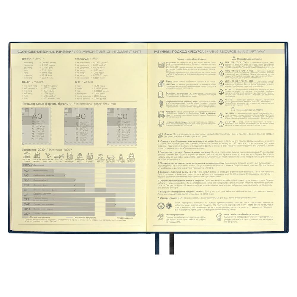 Ежедневник с гибкой обложкой и закладкой из искусственной кожи, дополнен капталом и двойным ляссе.