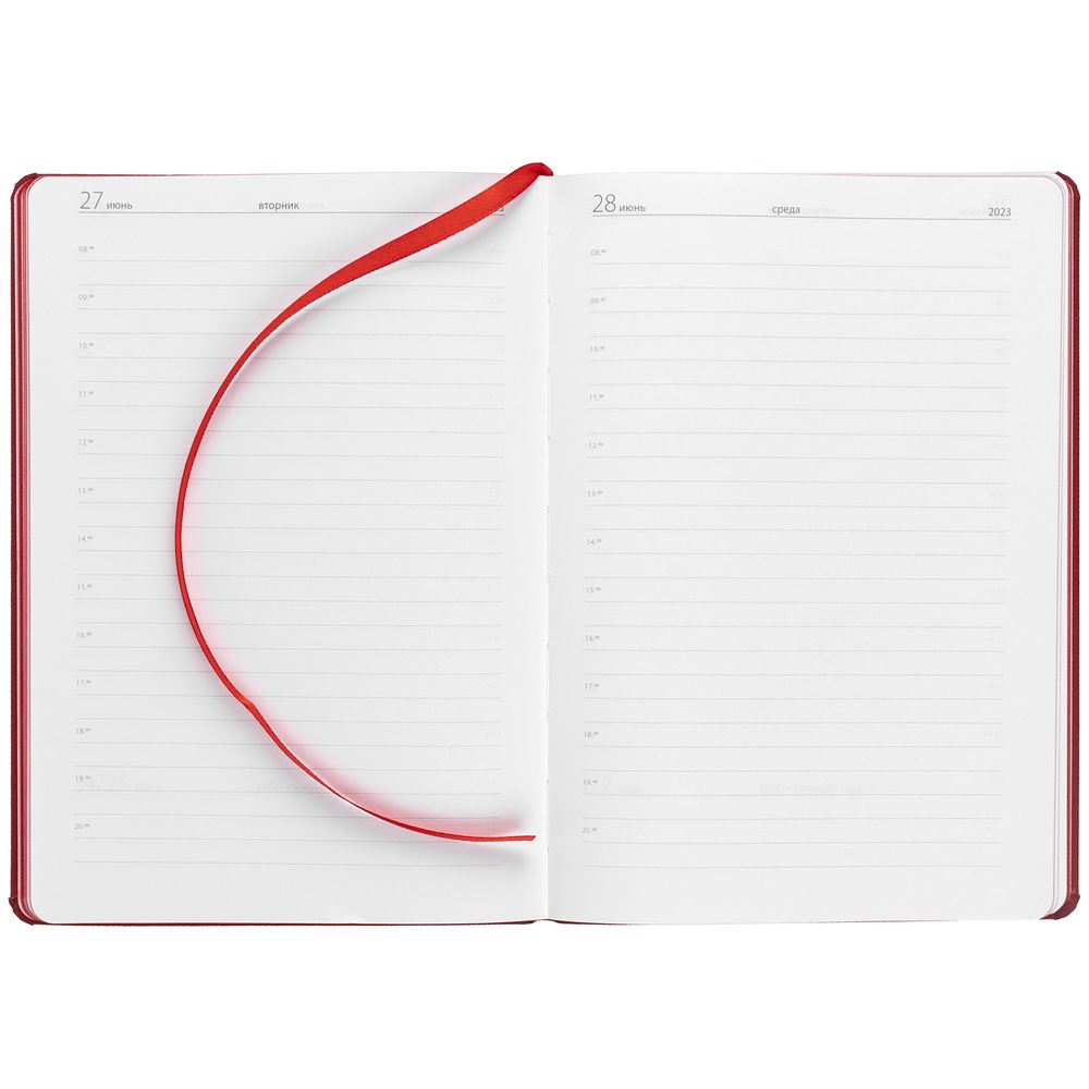 Ежедневник с полутвердойобложкой выполнен из материала Nice Touch, красный PP, и дополнен резинкой шириной 1 см с металлическим шильдом и ляссе красного цвета.