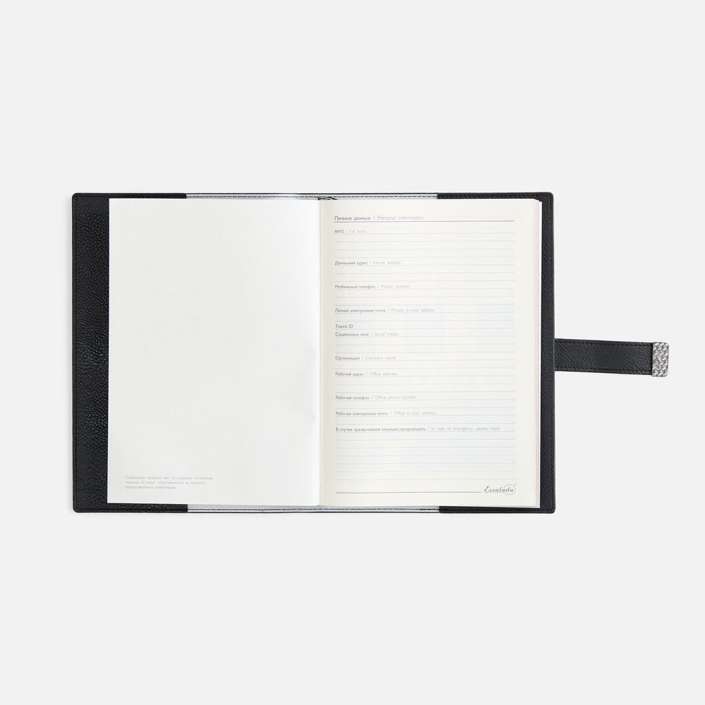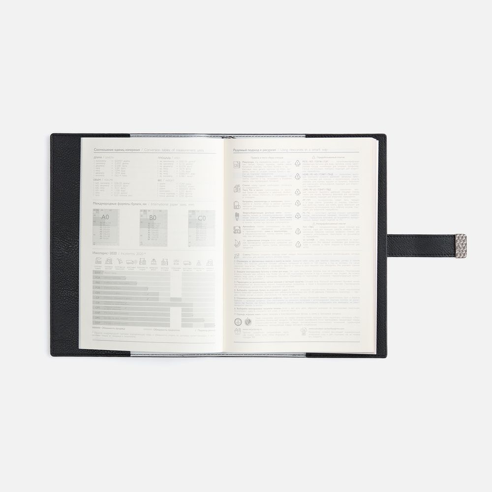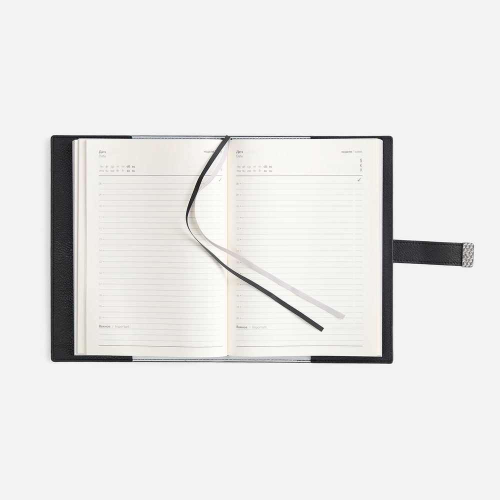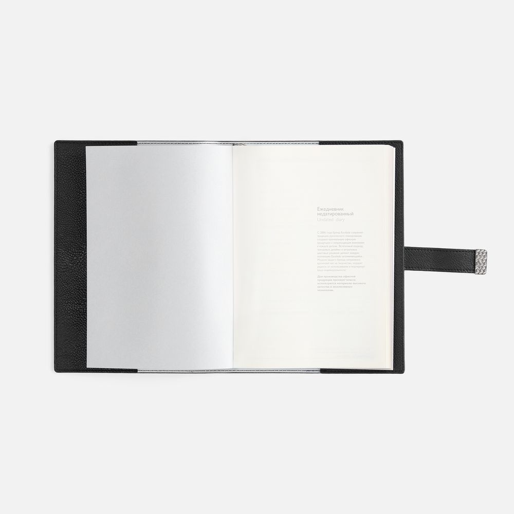 Ежедневник в мягком переплете со съёмная обложкой, дополнен застёжкой-хлястиком  с металлическим шильдом на кнопке, двойным ляссе и капталом.