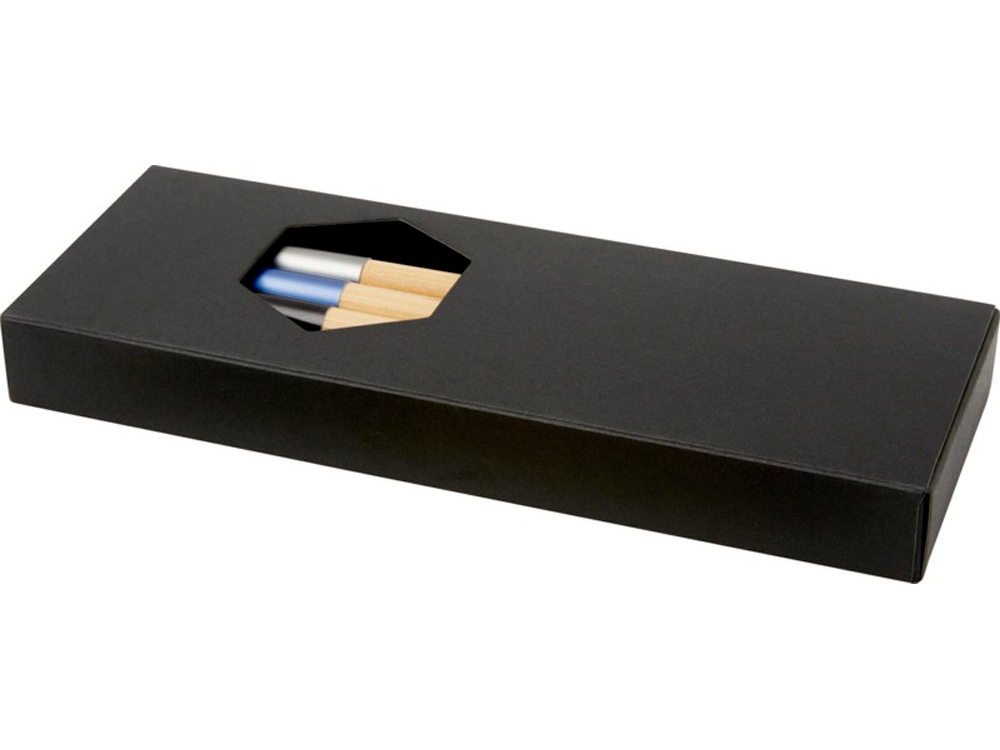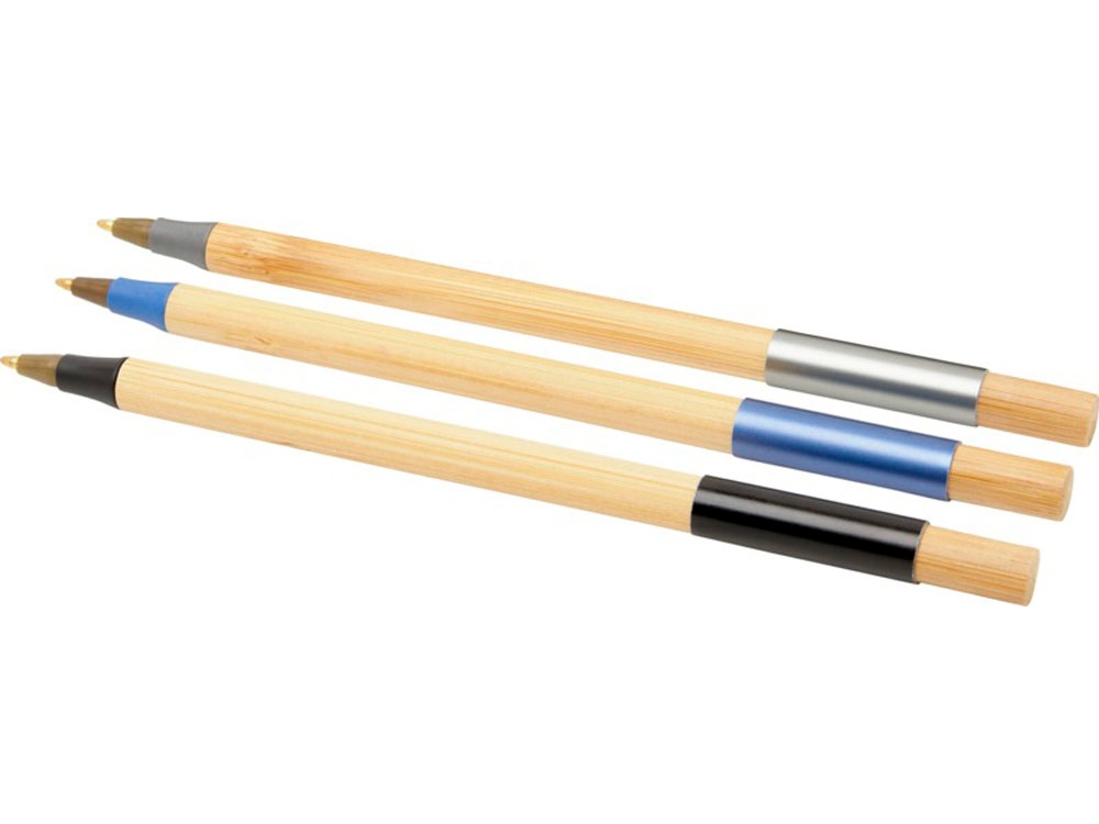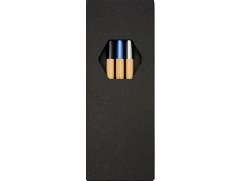 Комплект шариковых ручек с эксклюзивным дизайном, состоящий из трех шариковых ручек с цветовым акцентом. Шариковая ручка с синей алюминиевой пластиной предварительно заполнена синими чернилами, а две другие ручки предварительно заполнены черными чернилами. Упакован в черную подарочную коробку. Бамбуковое дерево, Алюминий.
