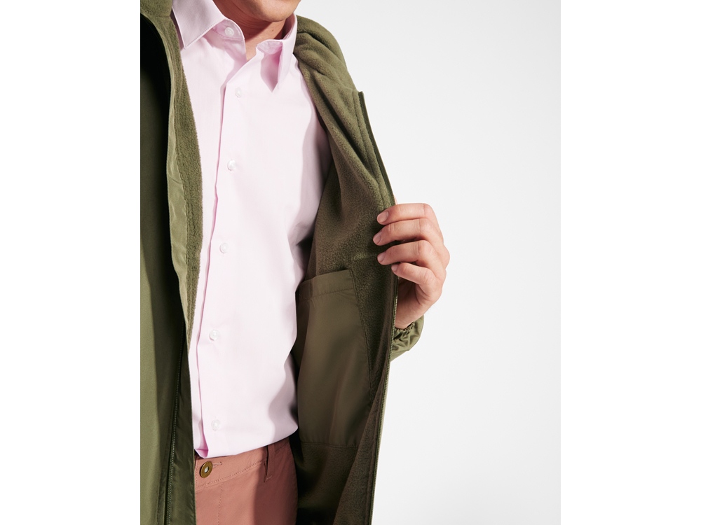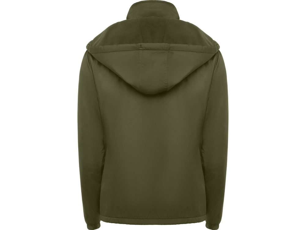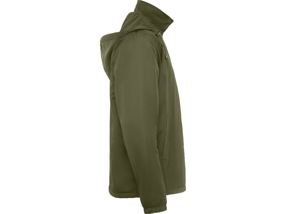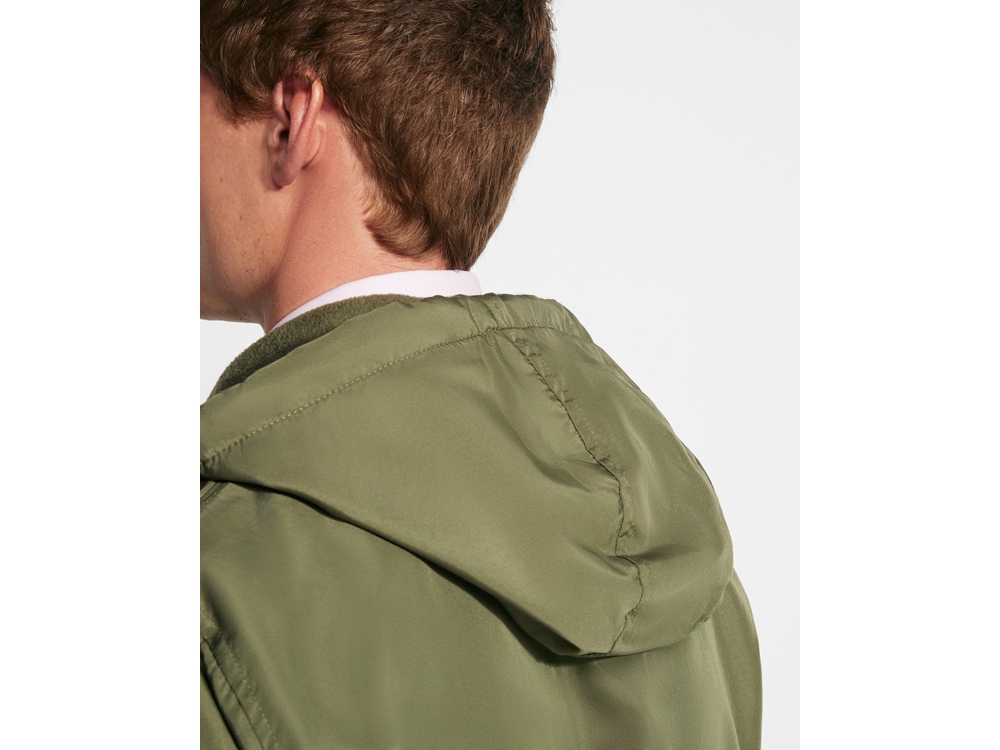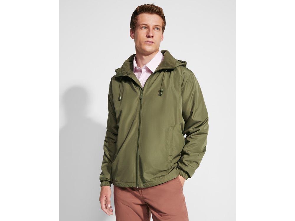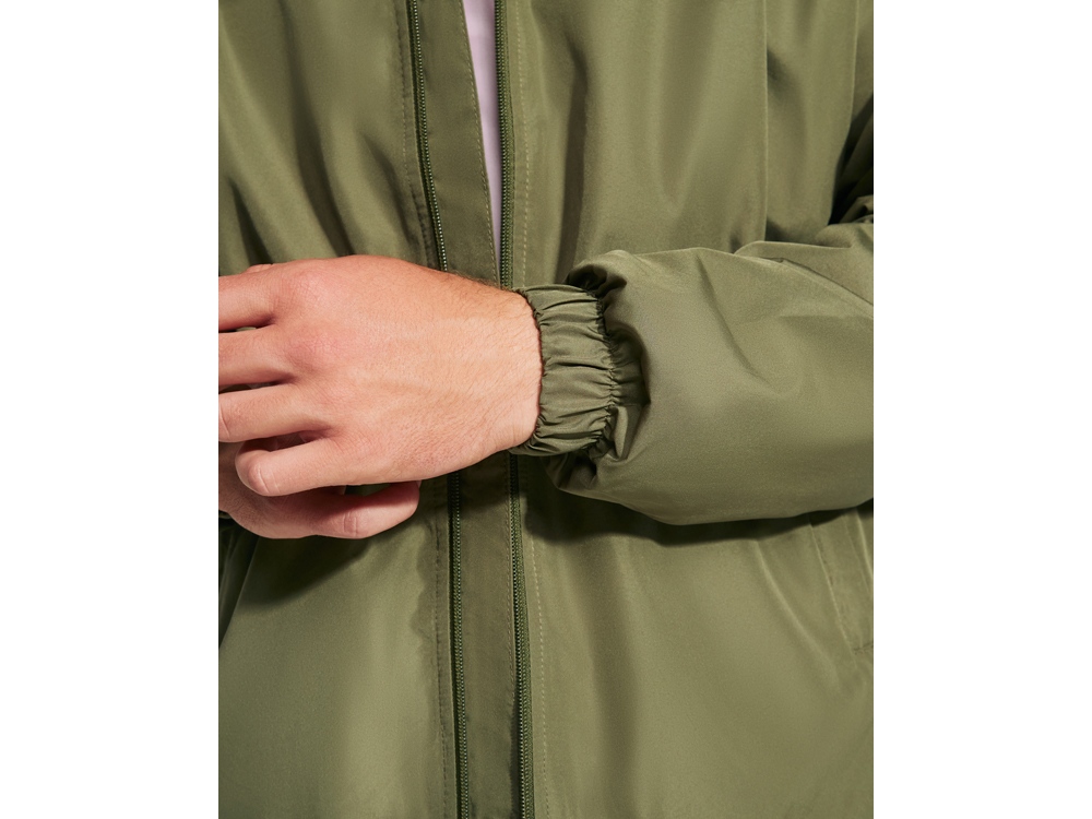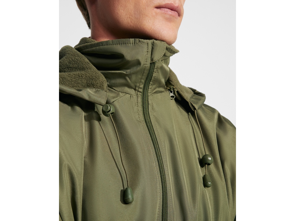 Легкая водонепроницаемая куртка. · Высокий воротник и складывающимся капюшоном с регуляторами. · Подкладка из микрофлиса. · Центральная застежка·молния и защита для подбородка. · Эластичные манжеты. · Два боковых кармана на застежке·молнии. · Внутренний левый нагрудный карман.