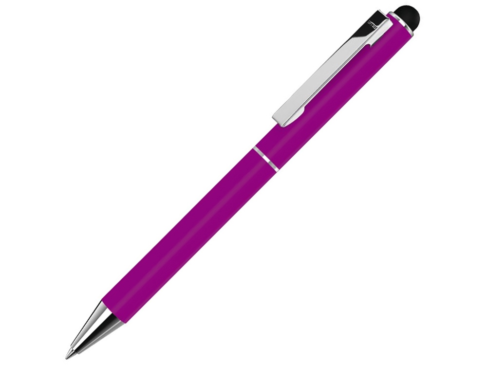 Металлическая шариковая ручка с матовой поверхностью, металлическим клипом, металлическим наконечником и кнопкой с глянцевой серебристой отделкой, прорезиненным ободом для сенсорного регулирования.