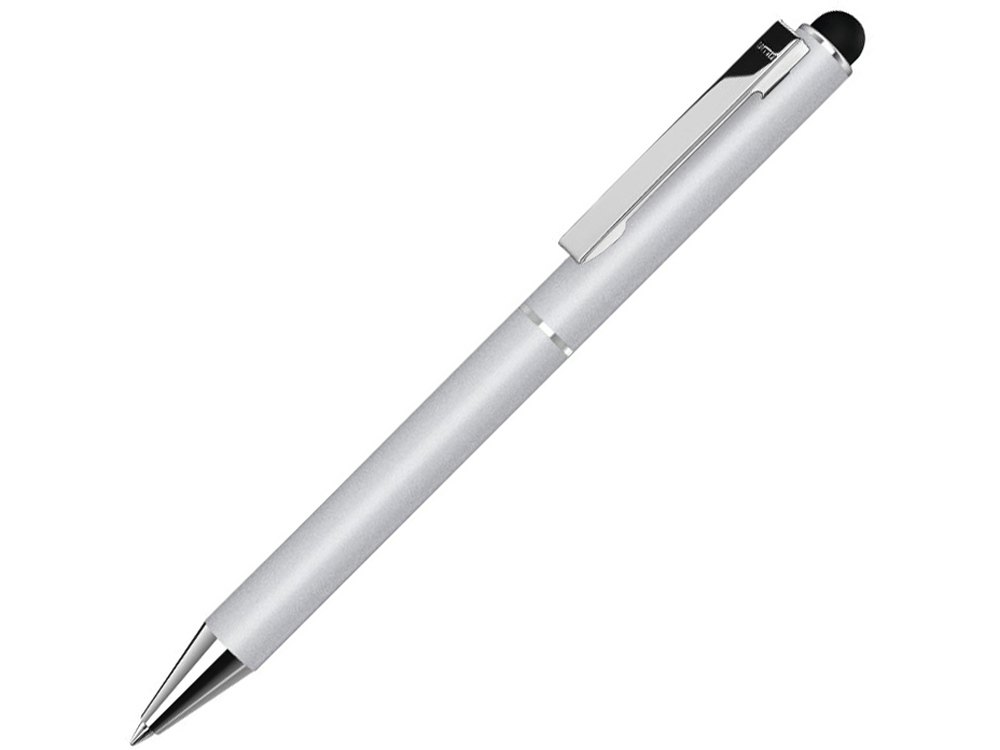 Металлическая шариковая ручка с матовой поверхностью, металлическим клипом, металлическим наконечником и кнопкой с глянцевой серебристой отделкой, прорезиненным ободом для сенсорного регулирования.