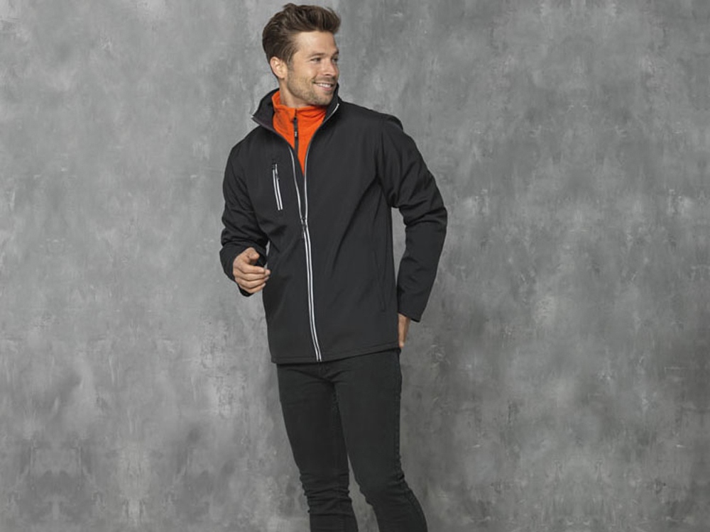 Мужская куртка софтшелл Orion. Отрезной-отрывной ярлык для комфорта. Нагрудный карман на молнии. Карманы. Внутренняя планка. Петелька-вешалка. Механическая стрейч-ткань из 100 % полиэстера с переплетением микрофлиса со 100 % полиэстером. 250 г/м².