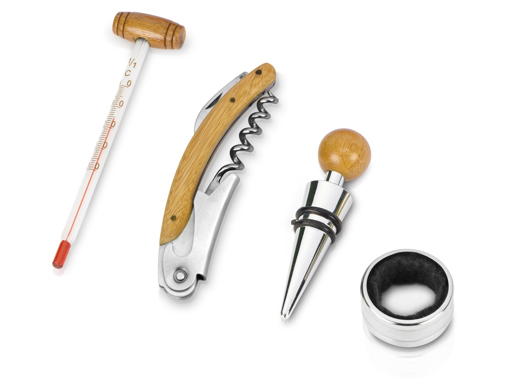 В набор аксессуаров для вина входят штопор-открывалка, воротничок на бутылку, пробка для бутылки и даже термометр. Набор поставляется в презентабельном деревянном футляре.