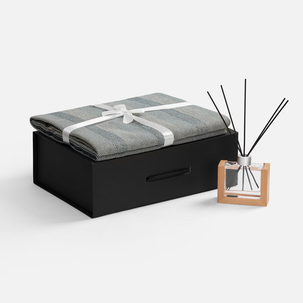 Материал флакон - стекло, палочки из файбера; подставка для флакона - дерево; плед - хлопок 95%, полиэстер 5%, плотность 300 г/м²; коробка - переплетный картон, бумага Malmero