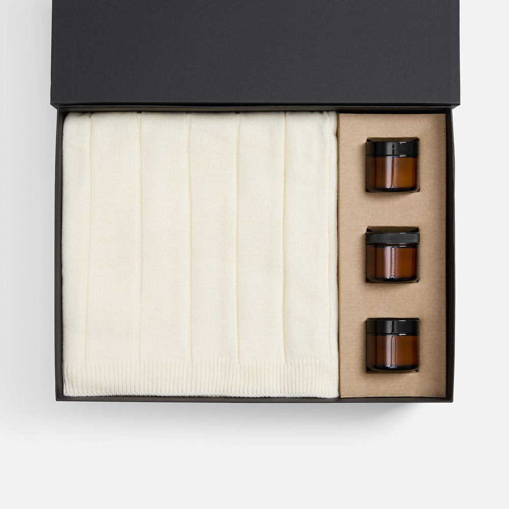 | Материал | плед - акрил 100%, плотность 310 г/м² ; подсвечник - стекло, крышка - пластик; свеча - парафин, соевый воск, парфюмерная композиция; коробка - переплетный картон, бумага Magic |
