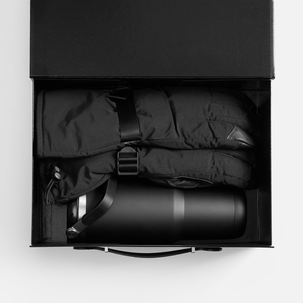 Материал варежки - полиэстер 100%, утеплитель - 3M Thinsulate, плотность 100 г/м²; вставки - натуральная кожа; внешняя стенка термостакана - нержавеющая сталь, 201, внутренняя стенка - 304; крышка - пластик; коробка - переплетный картон; искусственная кожа