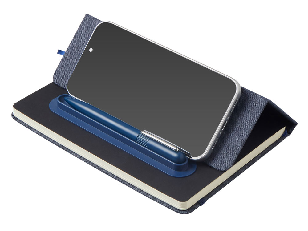 Набор блокнот А5 с магнитным держателем для ручки и подставкой для телефона и металлической шариковой ручкой NotaBene, темно-синий купить оптом и в розницу с нанесением логотипа в Воронеже