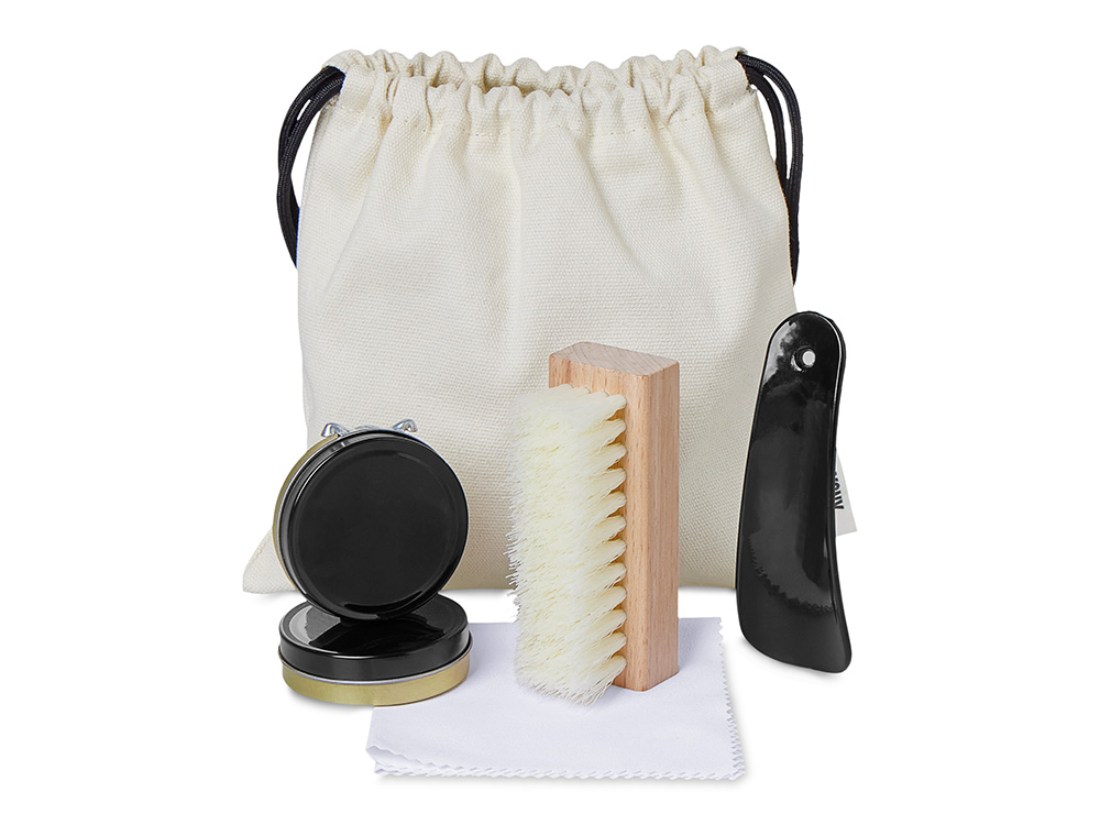 Чистая и ухоженная обувь — в одном стильном наборе. Внутри хлопкового мешочка с завязками можно найти всё для аккуратного ухода: прозрачный и чёрный крем для обновления внешнего вида обуви, щётку для их нанесения, салфетку из микрофибры для деликатной очистки и удобную ложку для обуви. Набор очень удобно брать с собой, при этом в нем есть все необходимое, чтобы обувь оставалась чистой и ухоженной в любой ситуации.