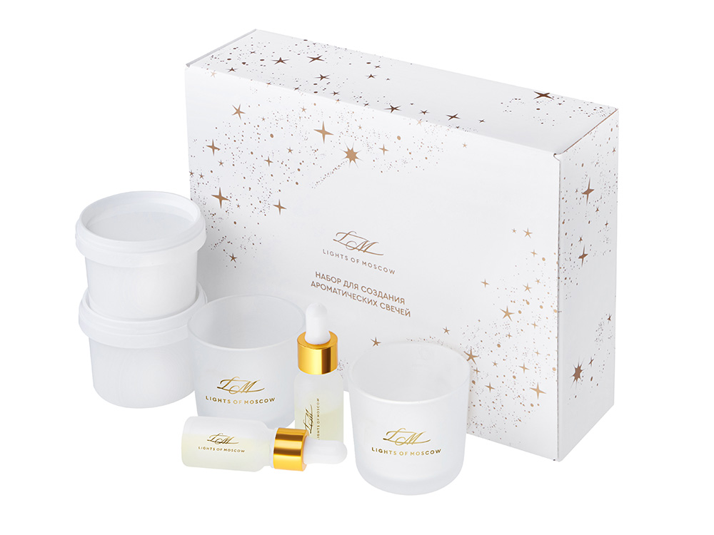 Уникальный набор для изготовления ароматических свечей станет приятным подарком и погрузит в увлекательный процесс. Набор выполнен в подарочной коробке с ложементом, в него входят все необходимые компоненты и подробная инструкция. Откройте для себя удивительный мир ароматов с Lights of Moscow! Вы сможете создать две невероятные композиции, которые точно понравятся Вам и Вашим близким! Условия хранения: — Свечи: +18…+24 °C, вдали от источников тепла, сквозняков и прямых солнечных лучей. — Рекомендуемая влажность — не более 50%. — Избегайте длительного воздействия яркого света. В комплекте: Подарочная брендированная коробка с ложементом - 1 шт. Стакан стеклянный матовый с тиснением логотипа LM 100 мл - 2 шт. Контейнер с соевым воском – 2 шт. Флакон стеклянный матовый c тиснением логотипа LM с ароматической отдушкой – 2 шт. Деревянный фитиль с держателем – 1 шт. Хлопковый фитиль с держателем - 1 шт. Наклейка для крепления фитиля - 2 шт. Палочка для перемешивания - 2 шт. Салфетка - 1 шт. Перчатка - 1 шт. Открытка - 1 шт. Инструкция по изготовлению ароматических свечей – 1 шт.