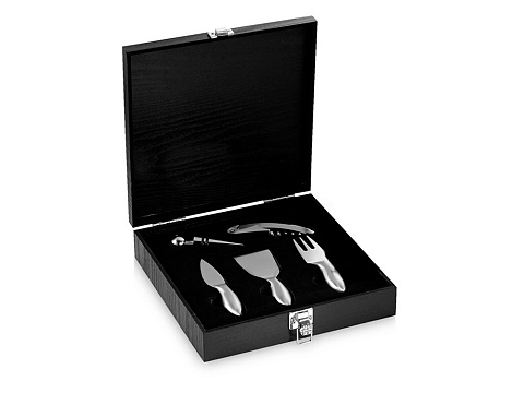 Набор для сыра и вина Mino. В этот набор из 5-ти предметов входит три ножа для мягкого сыра, твердого и зрелого сыра, стоппер для вина и штопор. Набор предлагается в деревянной подарочной коробке с шильдом 40 х 25 мм для лого.