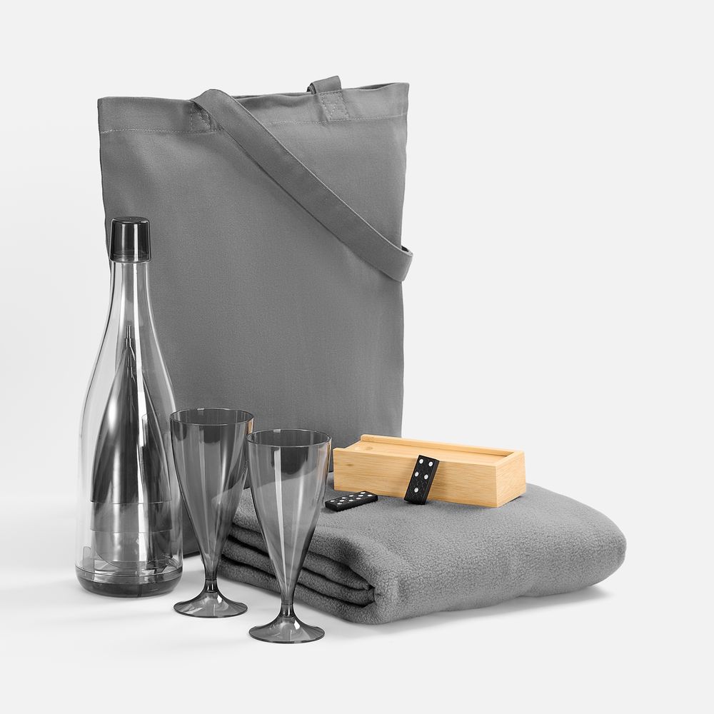 Материал плед - флис, плотность 180 г/м²; набор бокалов - пластик; футляр для домино - бамбук; костяшки - МДФ; сумка - хлопок 100%, плотность 220 г/м²; саржа