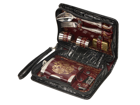 Оригинальный дорожный набор на 4 персоны в барсетке с удобным ремешком для переноски. Барсетка из искусственной кожи, отделка- натуральная кожа с художественным выжиганием. В набор входит: - фляжка 240 мл- 1 шт - стопка 30 мл- 4 шт - ложка столовая- 4 шт - вилка столовая- 4 шт - нож- 1шт - зажигалка- 1шт