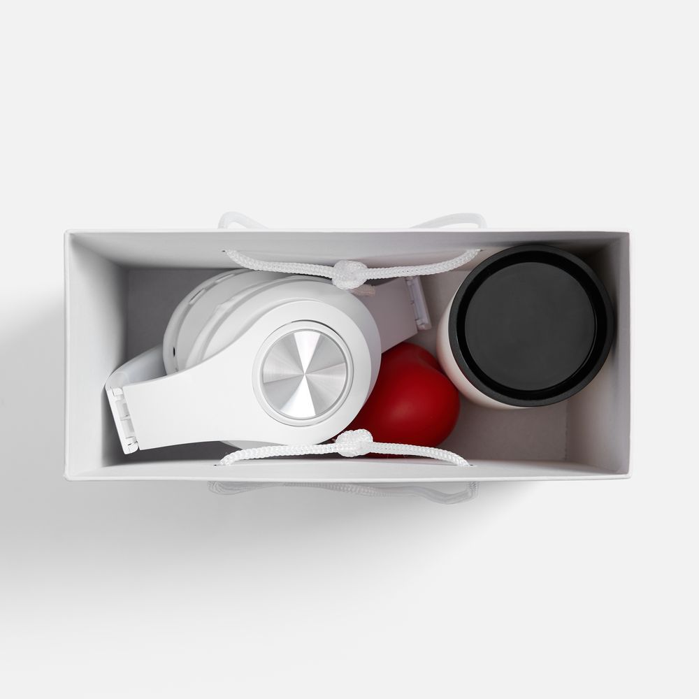 Материал наушники - пластик; термостакан - нержавеющая сталь, матовое покрытие; крышка - пластик, силикон; коробка - переплетный картон, бумага Magic; антистресс - вспененный полиуретан