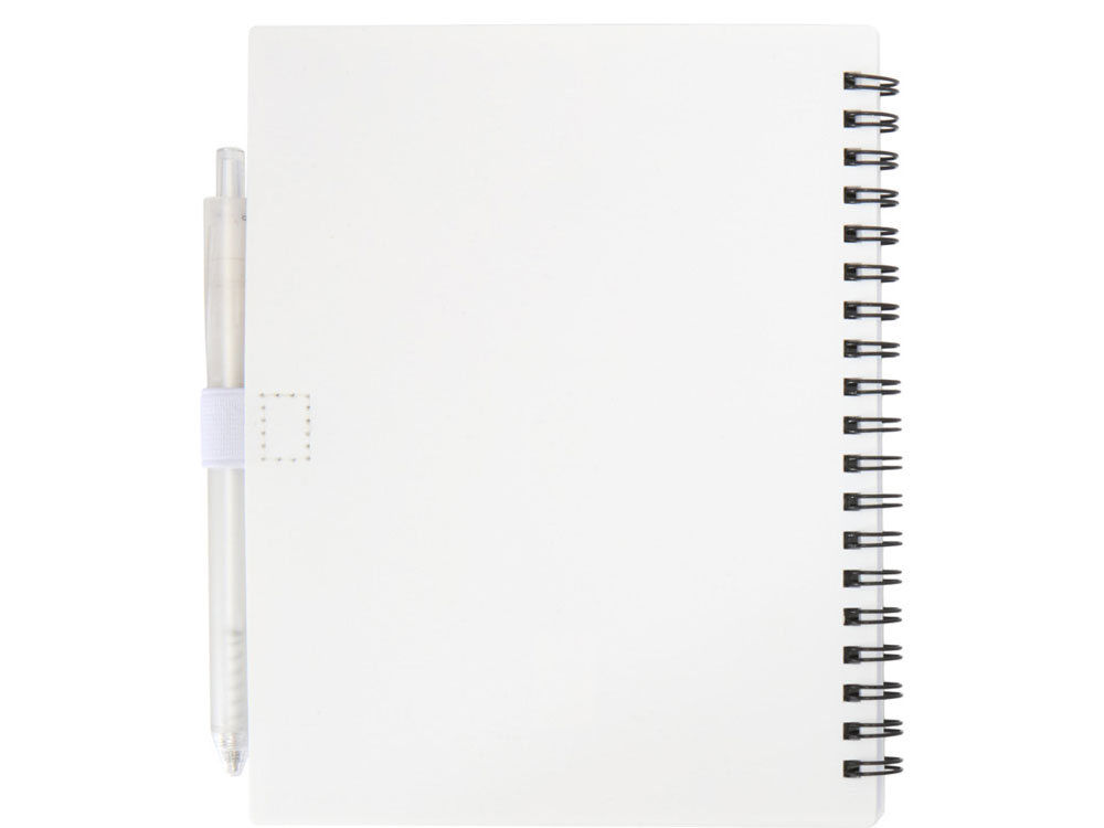 Блокнот Niove с мягкой обложкой изготовлен из переработанной пластмассы, имеет 70 нелинованных листов из бумаги плотностью 70 г/м². Блокнот имеет квадратные углы и петлю для ручки. Размер блокнота: 140 х 178 мм. Шариковая ручка также изготовлена из переработанной пластмассы. Цвет чернил: синий. Длина непрерывной линии: 1000 метров. Диаметр пишущего узла: 1,0 мм.