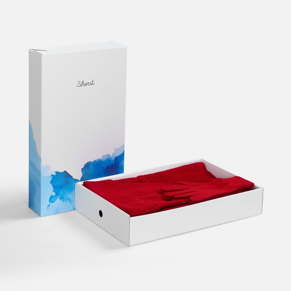 Удлиненная шапка с широким отворотом и фактурной вязкой мягко облегает голову, создавая элегантный силуэт. Широкий шарф с выразительным рельефом позволяет экспериментировать с драпировками, добавляя образу объем и динамику. Перчатки с аккуратной резинкой на манжете обеспечивают идеальную посадку и тактильный комфорт.