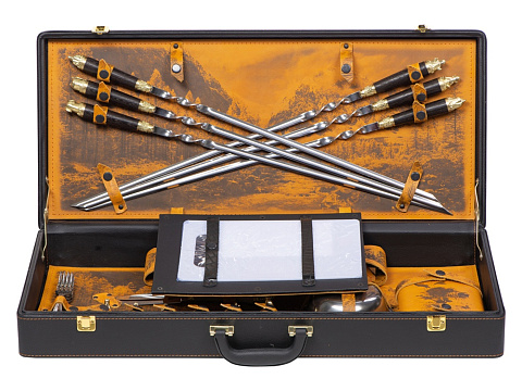 Кейс из сплит-кожи, с повышенной износостойкостью, внутренняя отделка натуральная кожа с художественным выжиганием. В комплект входит: - шампура большие d2,7 х 66 см - 6 шт - шампура мленькие 34,5 х 1 х 1,9 см- 6 шт - доска разделочная 29,5 х 20 см - вилка 19 х 2,5 х 1,8 см- 6 шт - нож 23 х 2,8 х 2,5 см - стопка 30 мл- 6 шт - тарелка d15 х 5 см- 6 шт - фляга 12,4 х 4 х 16 см - мангал 24,5 х 34,7 х 16,7 см