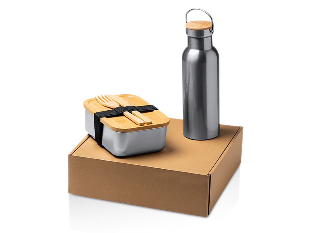 Полноценный обеденный набор из экологичных материалов. Подходит для офиса, учебы, путешествий или пикника. Поставляется в стильной экологичной коробке — отличный вариант для подарка. В комплекте: 1. Ланч-бокс (800 мл) - Материал: нержавеющая сталь 304 + крышка из натурального бамбука - Крышка фиксируется эластичной резинкой - Размеры: 16,2 × 12,3 × 5,7 см 2. Бутылка (500 мл) - Материал: нержавеющая сталь 304 - Размеры: высота 22 см, диаметр 7 см 3. Столовые приборы - Бамбуковые: вилка и нож Уход: рекомендуется ручная мойка (допускается мытье в посудомоечной машине, но ручная мойка продлевает срок службы бамбуковых элементов).
