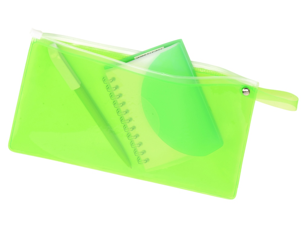 Цвет товара блокнот- прозрачный/зеленое яблоко, ручка- зеленое яблоко/белый, пенал- зеленое яблоко прозрачный