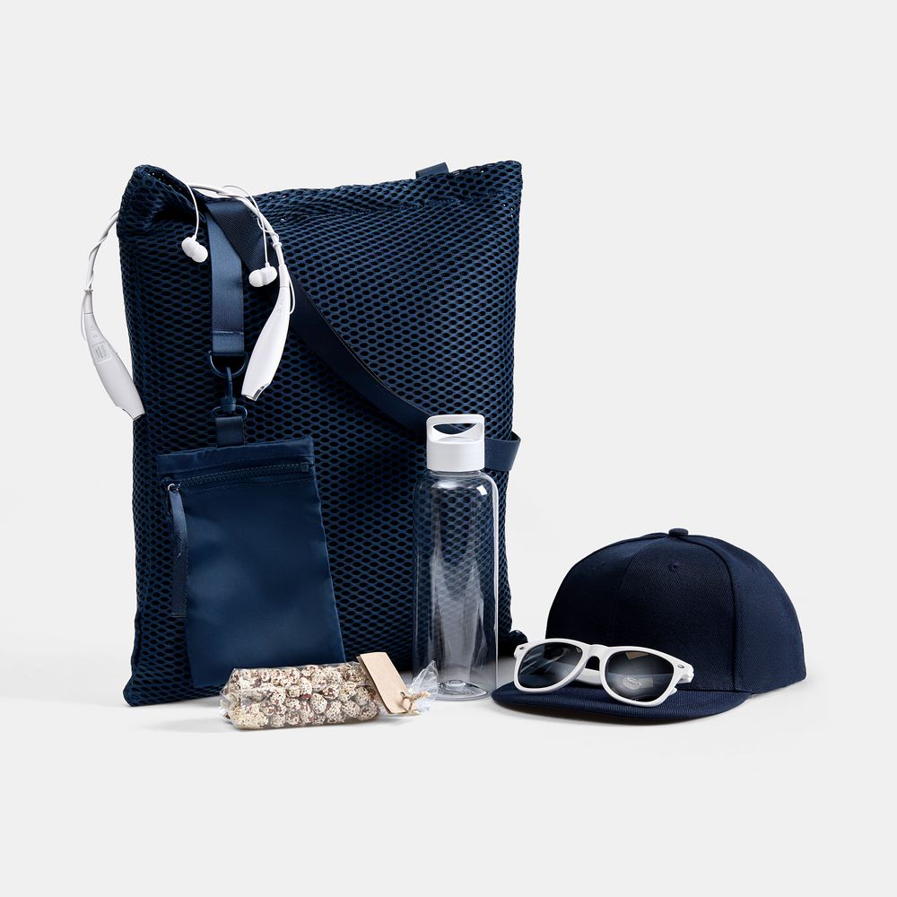 Материал шопер - полиэстер, твил 290D с полиуретановой пропиткой; трехслойная сетка; наушники, очки - пластик; бейсболка - полиэстер 100%, плотность 300 г/м²; бутылка - пластик, ПЭТ