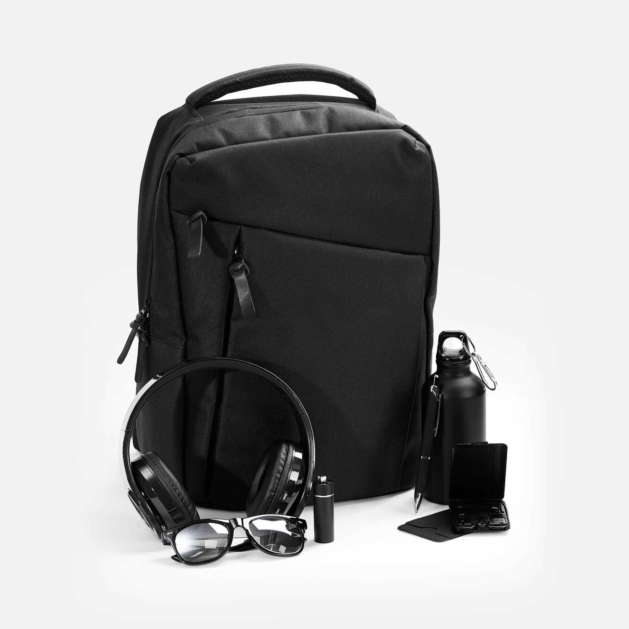 | Материал | рюкзак - полиэстер, 600D; ПВХ; наушники, органайзер, брелок - пластик; бутылка - алюминий; чехол - натуральная кожа; очки - пластик, поликарбонат; покрытие софт-тач; ручка - металл, грип - пластик; покрытие софт-тач |