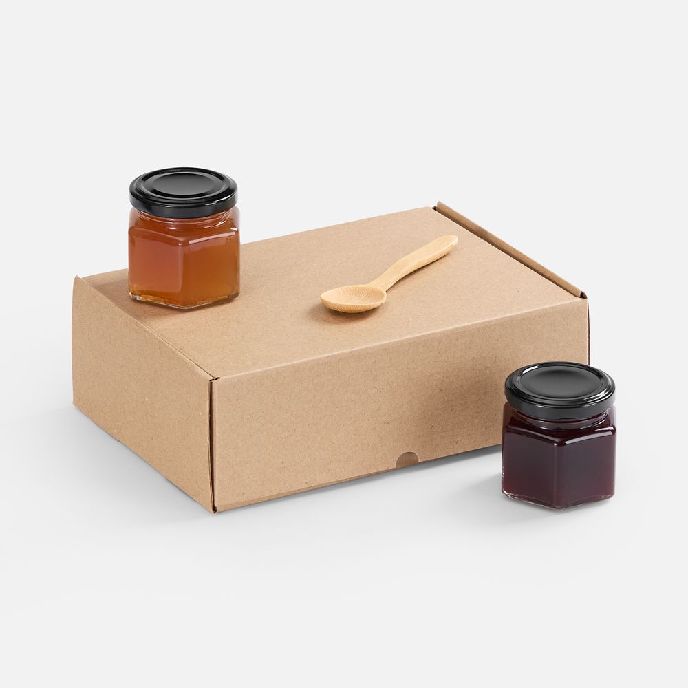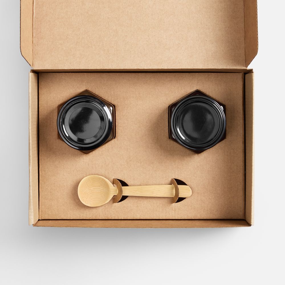 Материал коробка - микрогофрокартон; баночки - стекло, жесть; ложка - бамбук