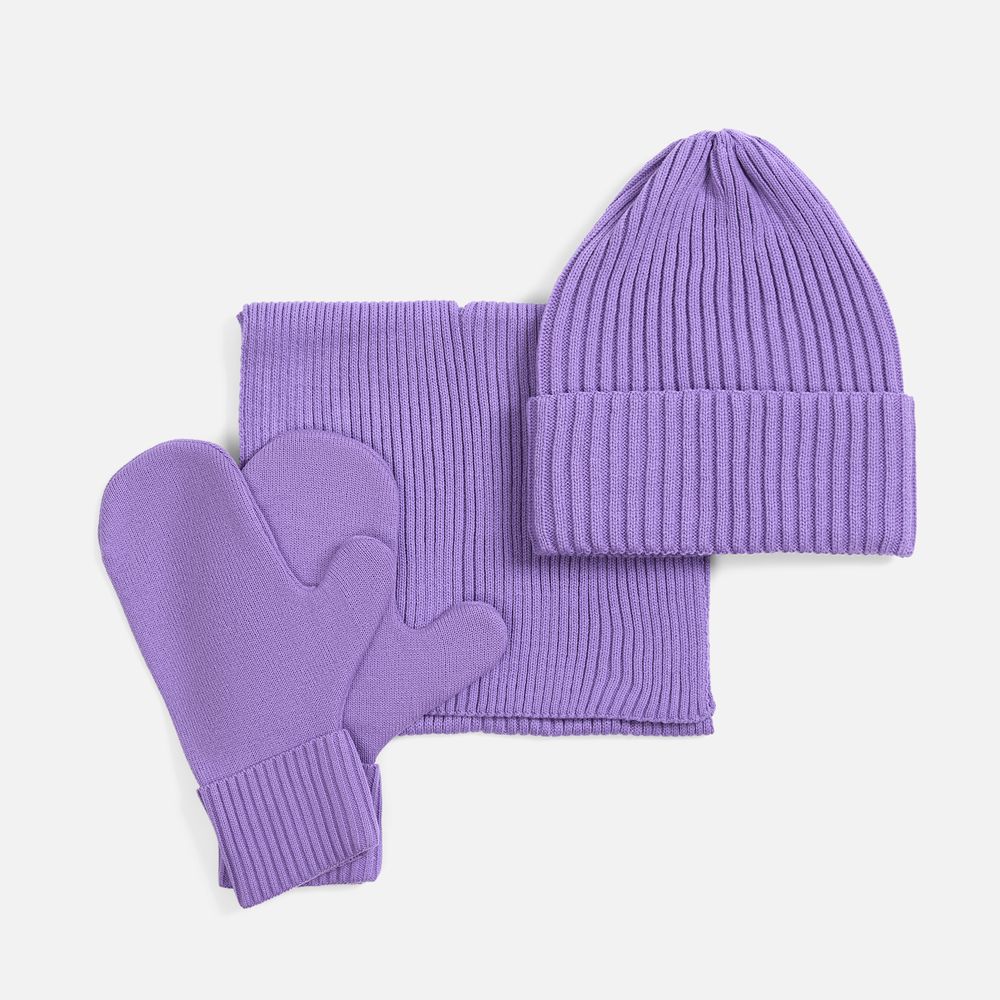 В набор входит удобный шарф с технологичным отверстием для быстрого завязывания, шапка с двойным отворотом и теплые двухслойные варежки с широкой манжетой. Все изделия связаны из акриловой пряжи, отличаются практичностью и элегантной простотой.