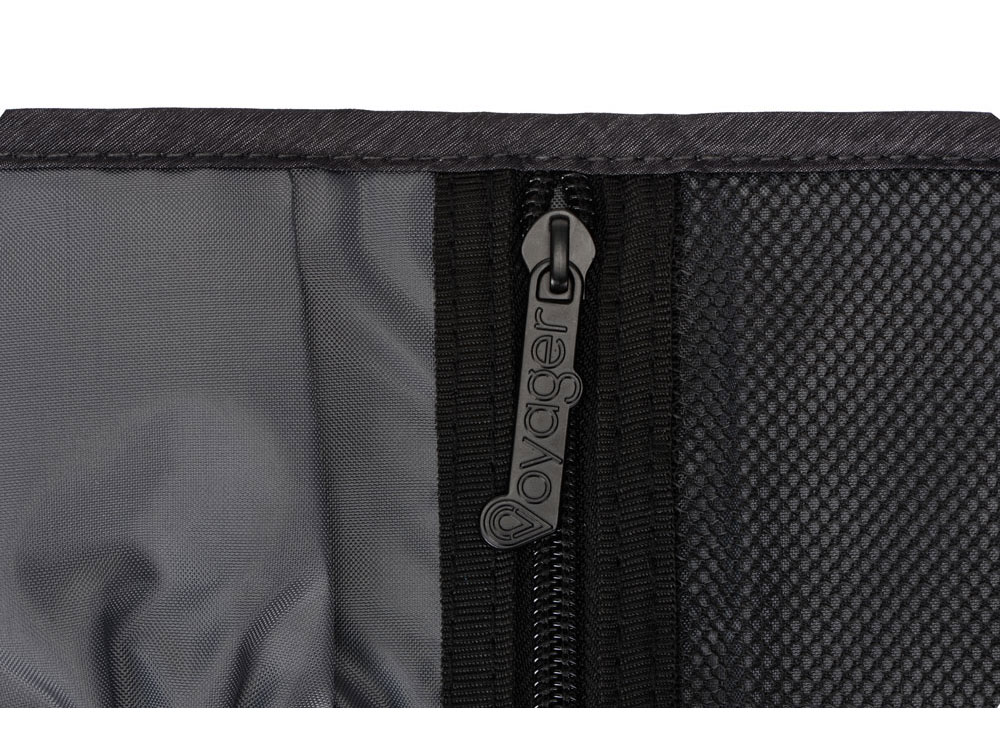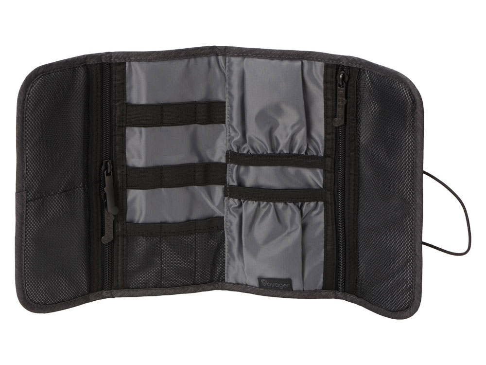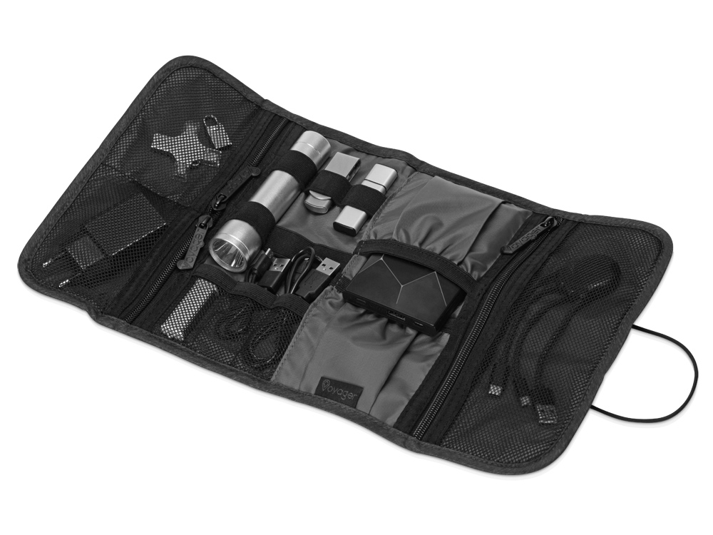 Органайзер District для электроники Voyager с множеством кармашков и отделений позволяет рассортировать девайсы, провода и другие аксессуары для техники удобным вам способом. Органайзер имеет 6 сетчатых кармашков, из них три на молнии, с бегунками, украшенными логотипом бренда. Кроме того, он имеет держатели для проводов и открытые карманы на резинке. Обложка закрывается на резинку, которая зацепляется за круглую пуговицу, и в сложенном виде органайзер весьма компактен, несмотря на свою вместительность. Благодаря форме его можно набить достаточно туго, ведь растягивающаяся резинка на обложке позволяет варьировать степень наполненности органайзера.