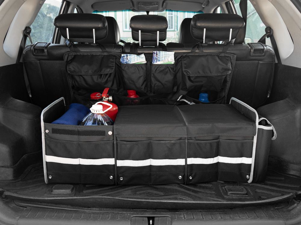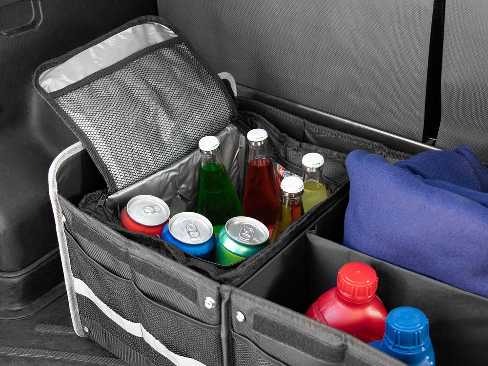 Органайзер состоит из трех основных отсеков, бокового кармана с клапаном и фронтальных карманов из сетки, что позволяет удобно хранить самые разные предметы: бутылки, сумки, инструменты, продукты и аксессуары. Также в комплект входит сумка-холодильник с водонепроницаемой подкладкой, которую можно вставить в одно из отделений, использовать отдельно, или сложить и убрать в боковой карман органайзера, когда она не нужна.