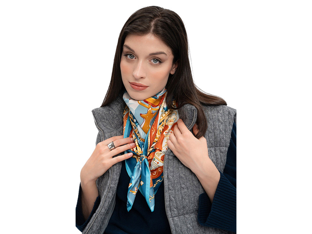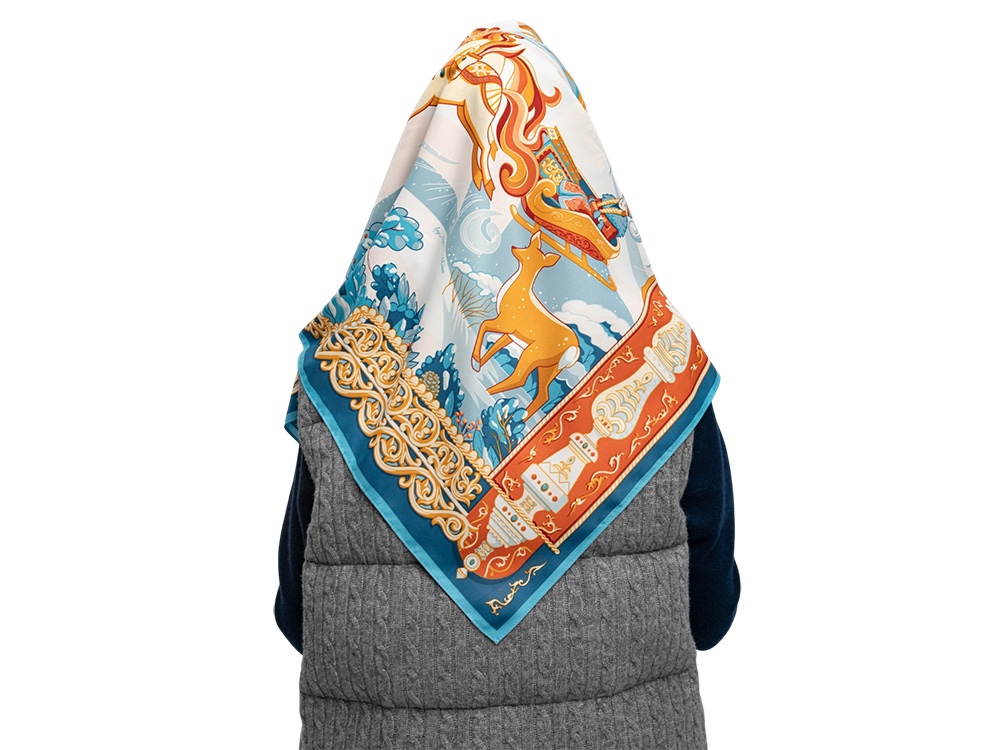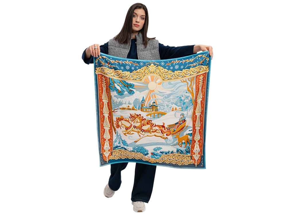 Русская зима, веками воспетая в искусстве, – чудесное время года, отражение национального характера и один из самых известных символов России. Зимушка-зима, как ласково называли её на Руси, – пора рождественских праздников, домашнего уюта и тёплых встреч, великолепия преображенной природы. Это и долгий сезон крепкого мороза, формирующий знаменитые русские качества: стойкость духа, выдержку и смелость. Платок Русская зима воплощает фольклорный образ красавицы-зимы. Художественное пространство выстроено подобно книжной иллюстрации, где центральный сюжет раскрывается в обрамлении узоров по мотивам деревянного зодчества. Тройка лошадей, сани с красной девицей, стилизованный облик Деда Мороза или Морозко, ели, припорошенные снегом, в окружении добрых лесных зверей, – наполнены глубоким символизмом и создают атмосферу волшебства. Православные церкви среди пышных сугробов, озаренные яркими солнечными лучами, знаменуют торжество веры, возрождения и любви. Платок Русская зима создан совместно с Ассоциацией МАКО. Автор идеи — Анна Ревякина. Мы желаем прекрасной обладательнице платка Русская зима, вдохновлённого традициями великой России, безграничного счастья и исполнения всех желаний! Над дизайном работали: Нина Ручкина, Анастасия Погодина, Анна Ревякина.