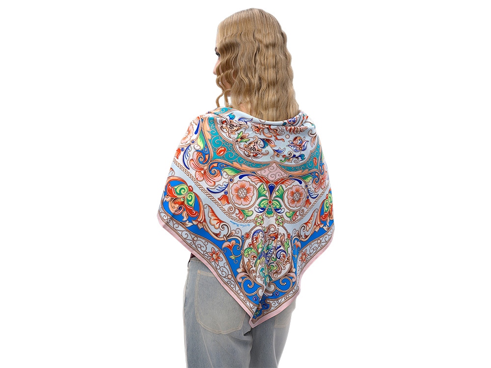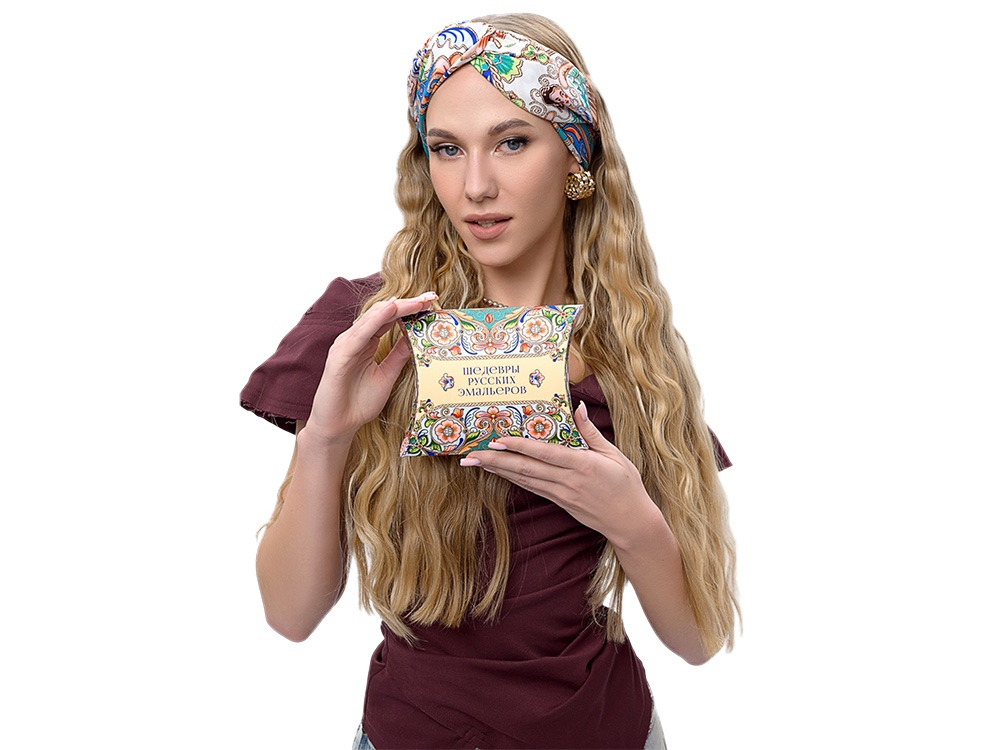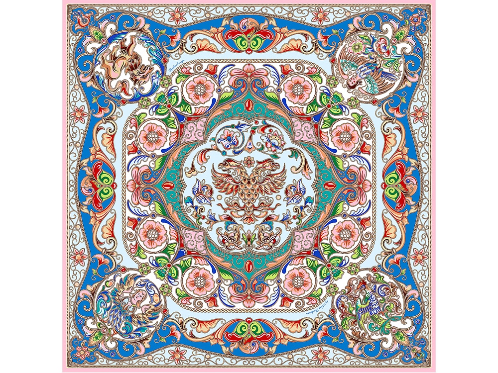 Издавна произведения отечественных мастеров эмальерного искусства славятся изысканностью рисунка и необыкновенным разнообразием красок. В дизайне аксессуара Шедевры русских эмальеров раскрывается филигранность изобразительного наследия эмали имперского периода. Сложная система многоцветного декора полотна, ажурная композиция причудливых растительных мотивов и христианской символики выражают дух русского творчества, воплощают красоту национальной художественной традиции. В центре изображен двуглавый орел – государственный герб Российской империи, триумфальный символ величия нашей страны. Платок Шедевры русских эмальеров станет яркой деталью стиля и знаковым памятным подарком. Над дизайном работали: Нина Ручкина, Анна Шулик.
