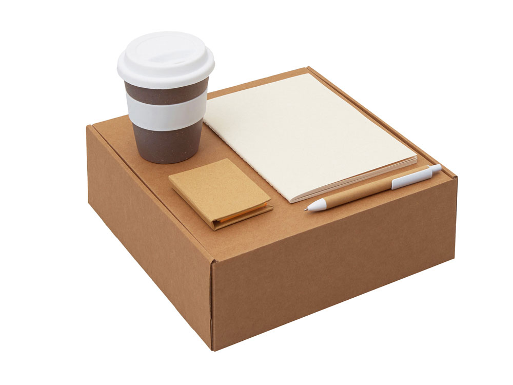 | Материал товара | блокнот- бумага из переработанных тетра-паков, ручка- картон, пластик, стакан- 50% бамбуковое волокно, 50% полипропилен, коробка- картон |