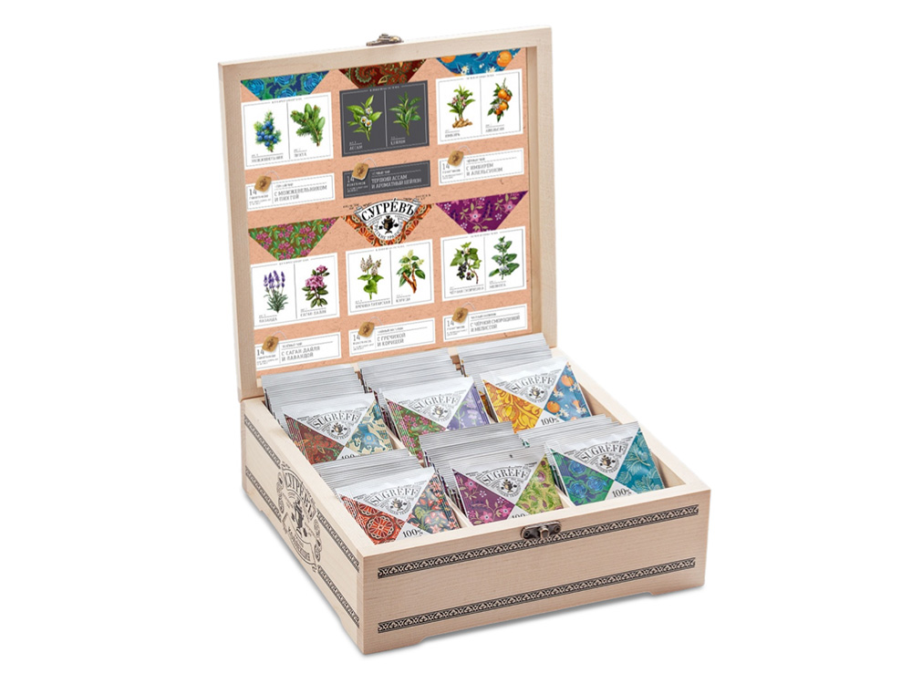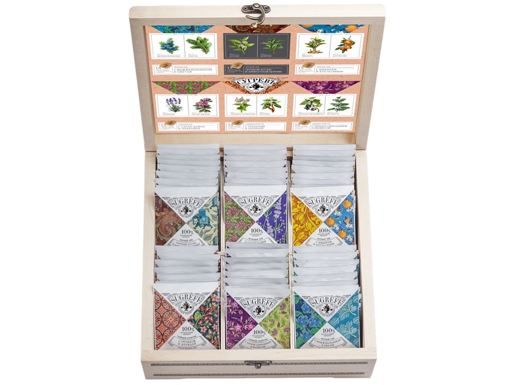 Набор представляет собой коллекцию из 6-и оригинальных купажей чая и чайных напитков в индивидуальных саше. В отличие от обычных пакетированных чаёв, наша продукция 100% натуральная. Яркие ароматы создаются благодаря естественному букету таких растений, как имбирь, апельсин, лаванда, пихта, можжевельник, чёрная смородина, мелисса и саган дайля. Набор многофункционален. Шкатулка с пакетиками будет эффектным и функциональным украшением вашей кухни или гостиной. В качестве чайного мини-дисплея она удобна для использования в офисе. Кроме того, набор является прекрасным подарком. В шкатулке находится 84 саше, по 14 на каждый из 6 вкусов. Состав: - Чай черный Терпкий ассам и ароматный Цейлон : чай черный индийский, чай черный цейлонский. - Чай черный С апельсином и имбирем : чай черный индийский, цедра апельсина, имбирь. - Чай черный С можжевельником и пихтой : чай черный индийский, ягоды можжевельника, хвоя пихты. - Чай зеленый С саган-дайля и лавандой : чай зеленый китайский, саган-дайля, лаванда. - Чайный напиток С гречихой и корицей : семена гречихи татарской в гранулах, корица. - Чайный напиток С черной смородиной и мелиссой: лист черной смородины, мелисса, лимонная трава.