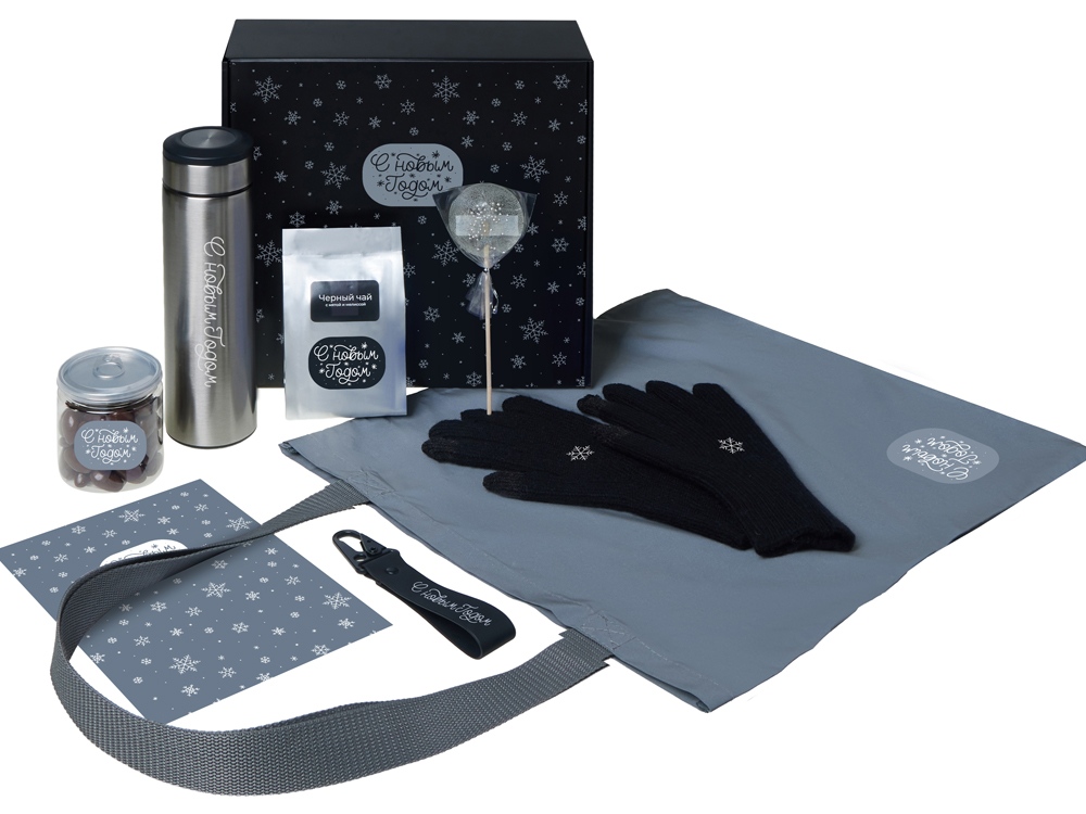 Подарочный набор с перчатками, термосом и чаем, черный купить оптом и в розницу с нанесением логотипа в Воронеже