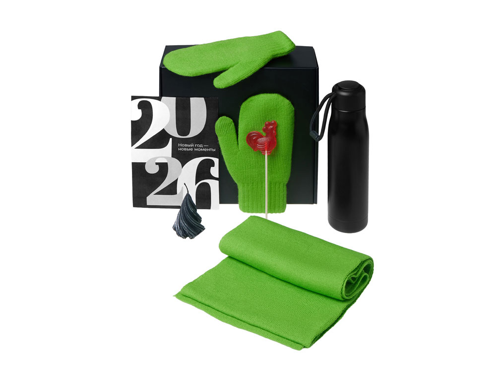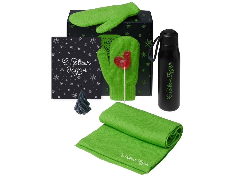 Подарочный набор с варежками, шарфом и термосом, зеленое яблоко