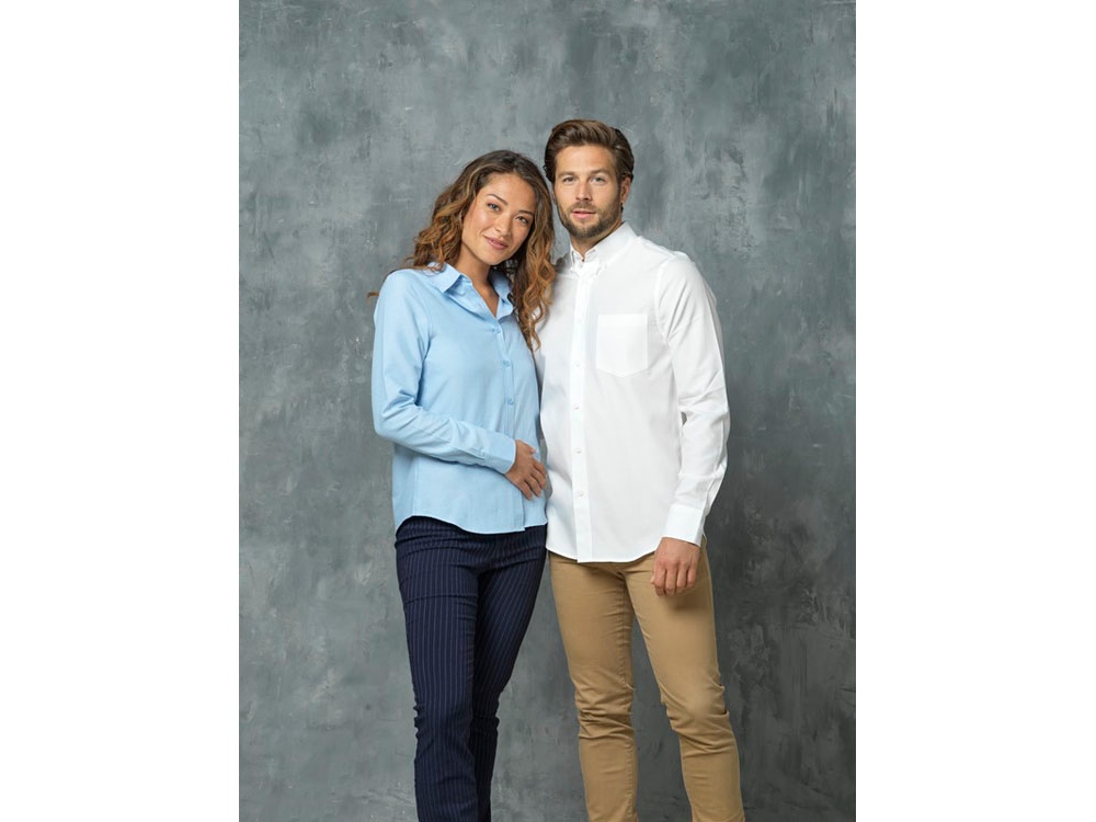 Pollux женская рубашка с длинными рукавами. Отрывной-отрезной лейбл. Регулируемая манжета рукава с одной складкой. Пуговицы в тон. Встречная складка на спинке. Ткань Оксфорд 55% хлопка, 45% полиэстера, 130гр.