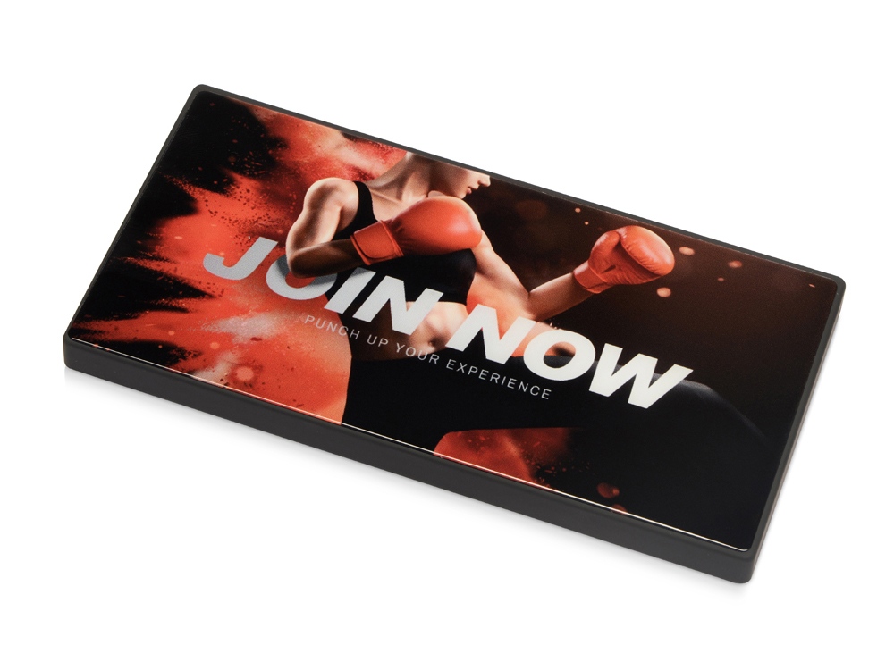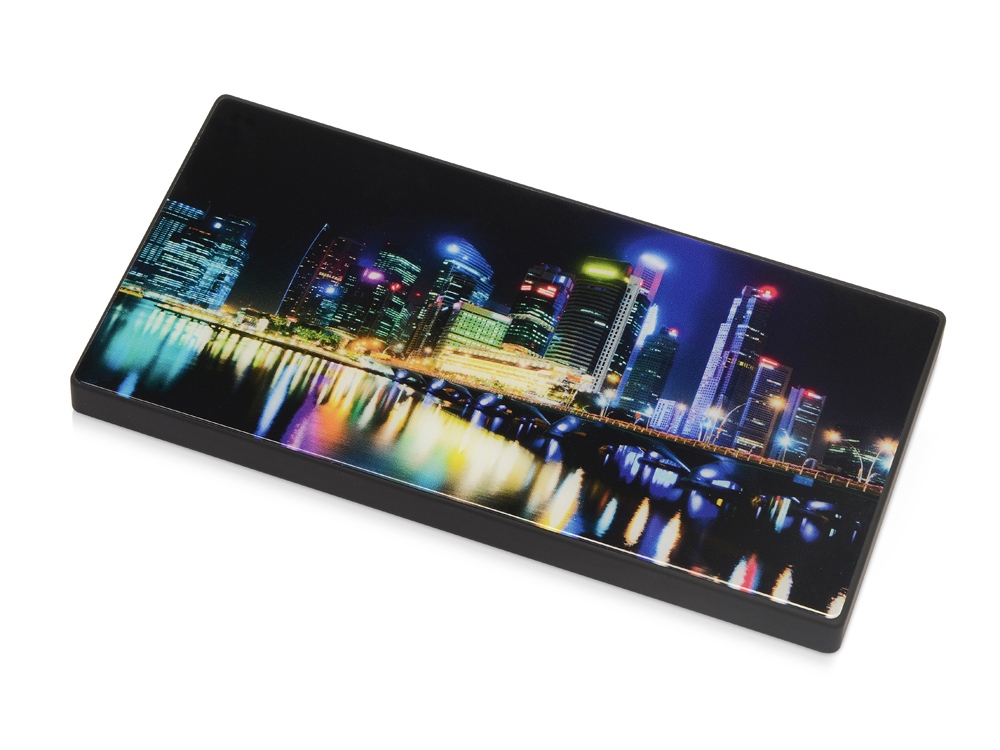 Повербанк емкостью 5000 mAh в строгом геометричном дизайне. Корпус сделан из качественного АБС-пластика с покрытием soft-touch. Ключевая деталь дизайна портативного аккумулятора — прочное закаленное стекло, которое можно декорировать. Оно обладает большим рекламным потенциалом: подходит для печати полноцветного контрастного изображения логотипа или других рекламных материалов. Закаленное стекло поставляется вместе с повербанком и легко крепится на корпус после запечатки. Основные характеристики пауэрбанка: - Литий-ионная полимерная батарея 5000 mAh. - 2 зарядных USB-порта. - Soft-touch покрытие.
