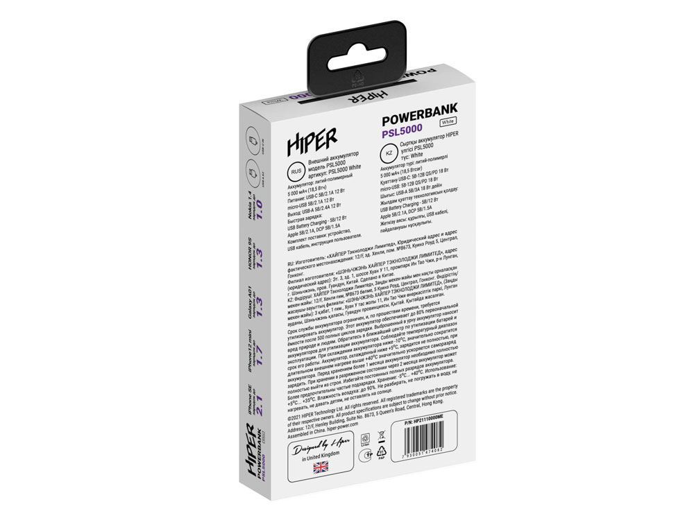 Портативный внешний литий-полимерный аккумулятор HIPER PSL5000 Black емкостью 5000 мАч (18,5Втч) оснащён входом USB-C для зарядки, Micro-USB входом для зарядки, 2xUSB-A выходами, максимальный выходной ток 2,1А, максимальная мощность 12 Вт, тонкий корпус.