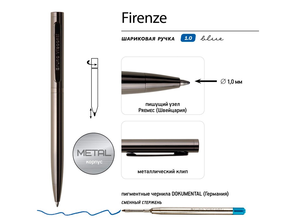Шариковая металлическая ручка из коллекции Firenze от Bruno Visconti - бизнес-аксессуар, с которым вы всегда будете чувствовать себя уверенно и комфортно. Лаконичный дизайн, строгость формы, прочный металлический корпус в цвет вороненой стали подчеркнут статус владельца ручки. Ручка автоматическая, с легким поворотным механизмом подачи стержня. Надежный пишущий узел d 1,0 мм (от швейцарского производителя Premec) гарантирует высокое качество так же, как и пигментные чернила Dokumental (Германия). Благодаря им писать ручкой Firenze одно удовольствие – она мягко скользит по поверхности бумаги, оставляя ровную, четкую линию.