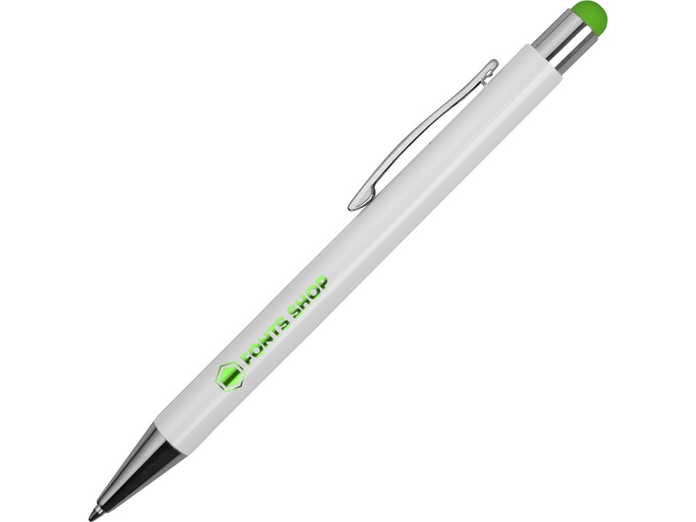 Металлическая шариковая ручка с нажимным механизмом и ярким стилусом.